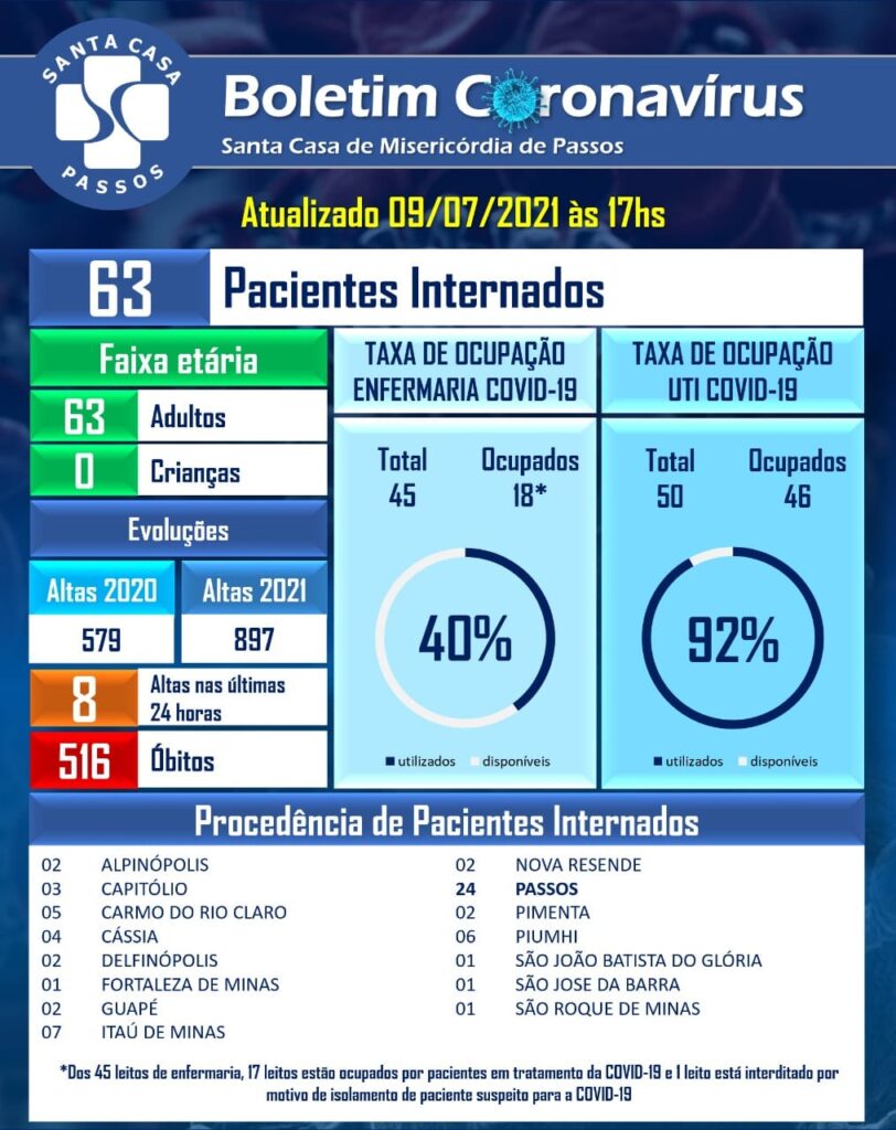 Nas últimas 24 horas, foram registrados 8 altas médicas e 2 óbitos. Veja a relação dos municípios e número de pacientes internados: