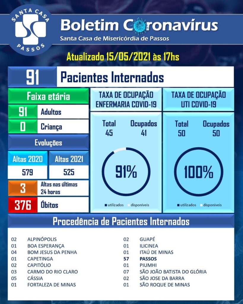 A ocupação dos leitos destinados a pacientes com COVID na Santa Casa de Passos continua sendo motivo de preocupação para os municípios da região que dependem do hospital para transferência, principalmente, de casos graves da doença.