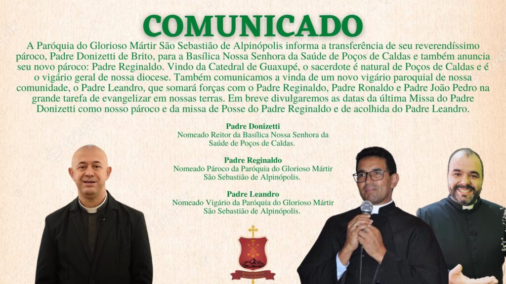 Em comunicado oficial feito pela paróquia, foi informado de que Padre Donizetti assumirá a Basílica de Nossa Senhora da Saúde, em Poços de Caldas. Para substituí-lo em Alpinópolis, foi nomeado o padre Reginaldo, vindo da catedral de Guaxupé.