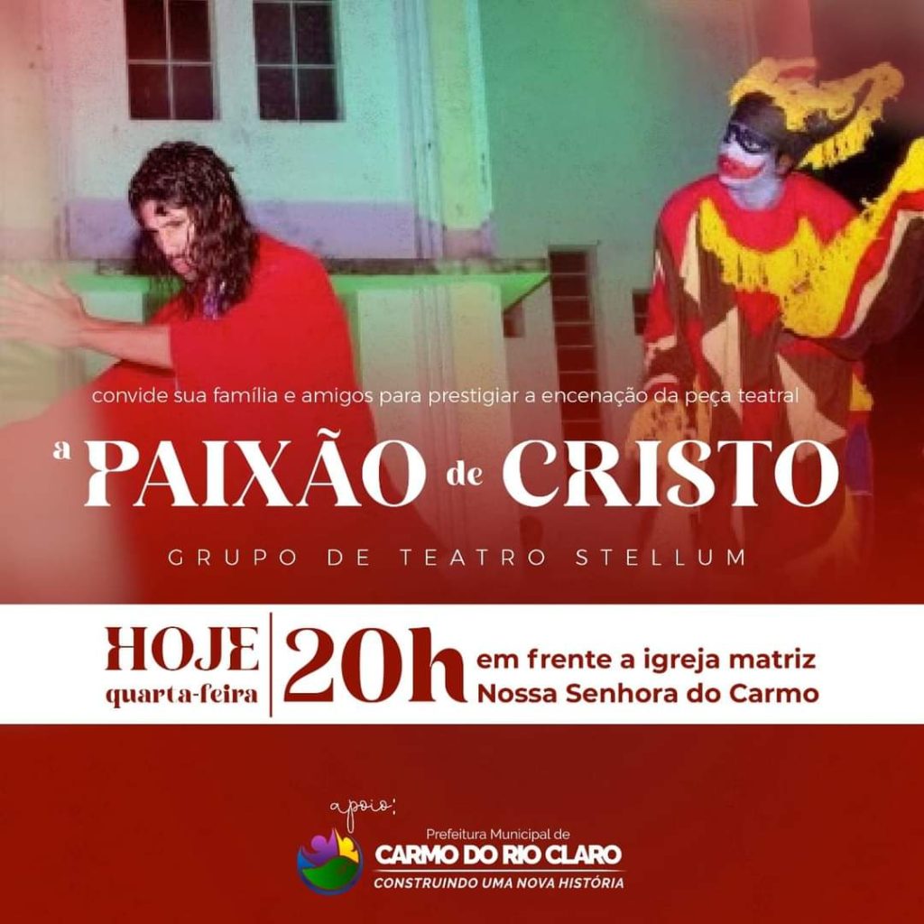 O espetáculo bíblico “A Paixão de Cristo“, será apresentado nesta quarta-feira (13), em Carmo do Rio Claro. A apresentação está marcada para às 20:00, e acontecerá em frente a igreja matriz Nossa Senhora do Carmo.