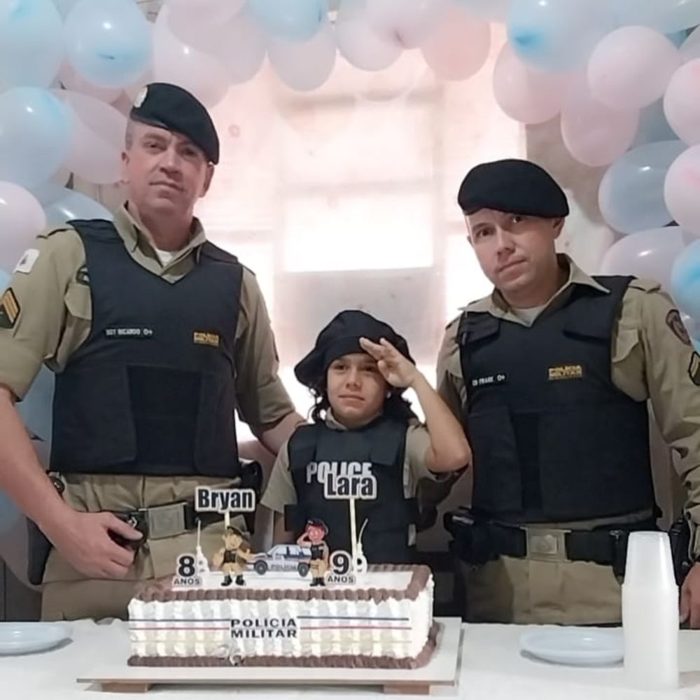 A pequena Lara Gabrielly, de apenas 9 anos, viu seu sonho ser realizado durante o seu aniversário no final de semana. Admiradora do trabalho da Polícia Militar, Lara pediu uma festa com o tema da PM e, para a sua surpresa, recebeu a visita dos policiais Frank e Ricardo em sua casa.