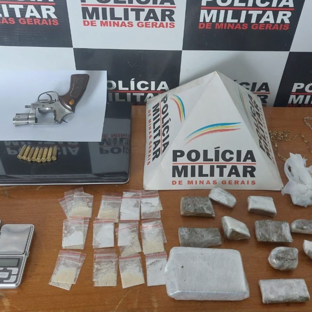 Três pessoas foram presas e a Polícia Militar apreendeu também 01 arma de fogo (revolver), 08 munições, 35 papelotes de substância análoga à cocaína, 12 papelotes de substância análoga à maconha, 1 tablete de maconha, 2 balanças de precisão, além de celulares e outros objetos.