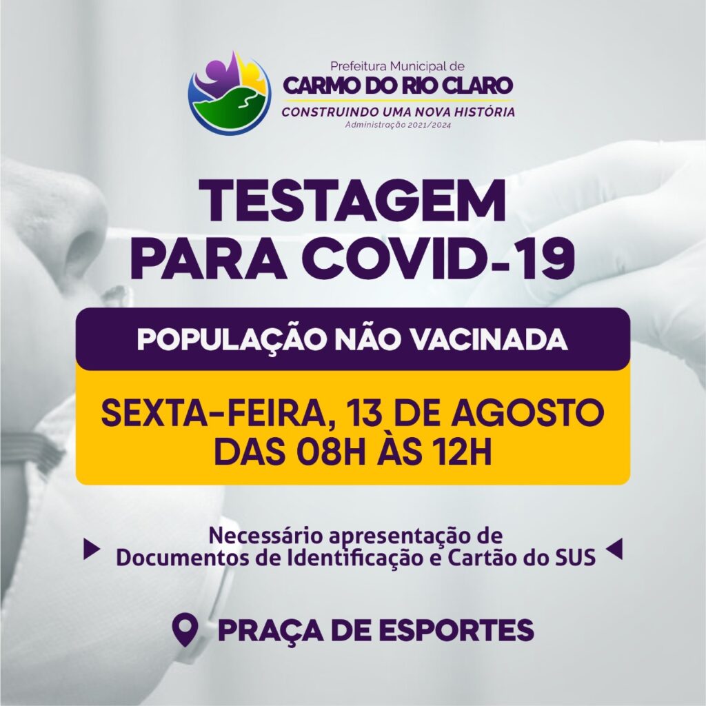 A testagem será realizada na Praça de Esportes, das 8h às 12h, nesta sexta-feira, 13 de agosto. Para realizar o teste é necessário apresentação de Documentos de Identificação e Cartão do SUS.