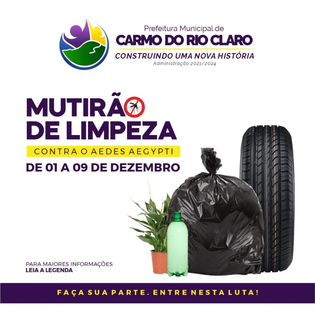 A Prefeitura de Carmo do Rio Claro através da Divisão de Vigilância em Saúde, Sanitária e Epidemiológica em parceria com o Departamento de infraestrutura, irá promover o mutirão de prevenção e controle de doenças como Dengue, Chikungunya, Zika, entre outras.