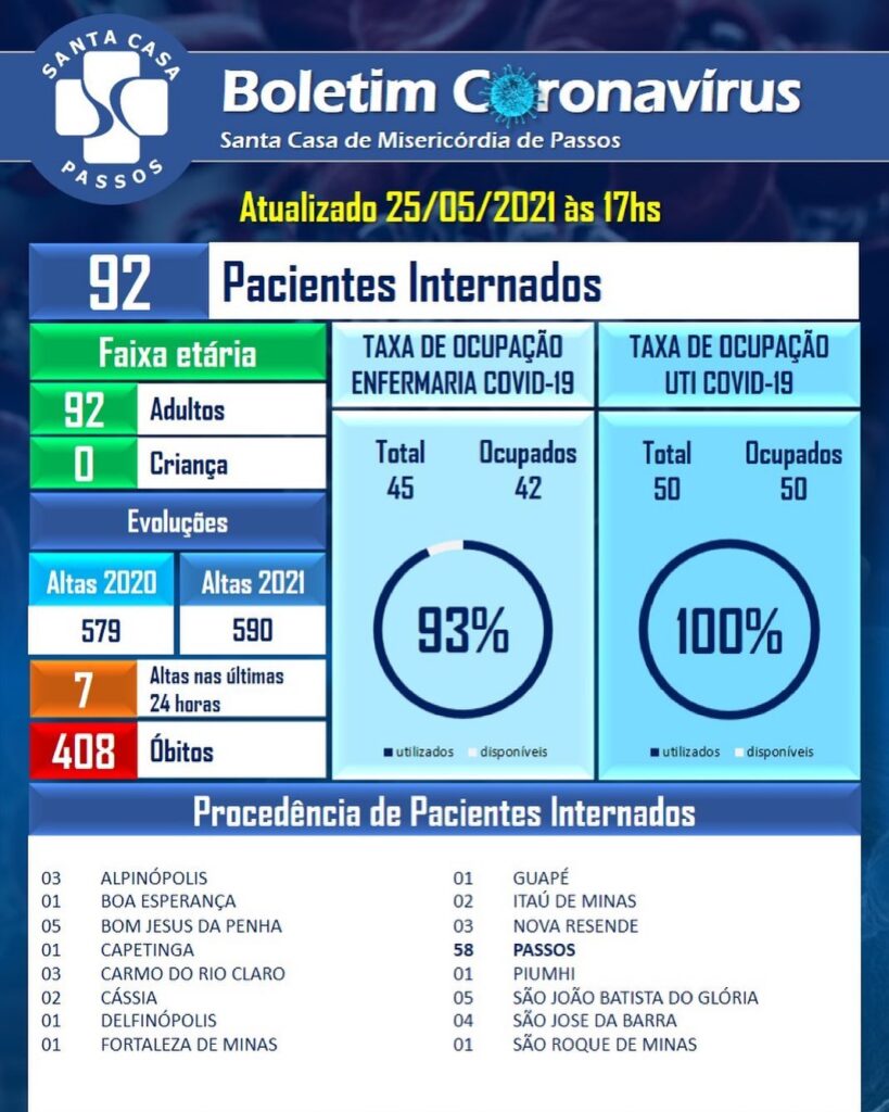 Em colapso e sem vagas para pacientes de COVID-19, a Santa Casa de Misericórdia continua com os leitos lotados. De acordo com o boletim divulgado nesta terça-feira, a unidade de terapia intensiva continua 100% ocupada e a de enfermaria está com 93% de ocupação. Nas últimas 24 horas foram registradas 07 altas médicas e 01 óbito.
