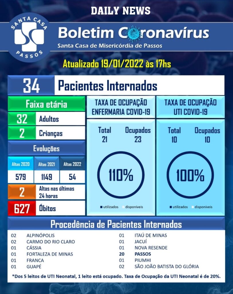 Ainda de acordo com o boletim, dos pacientes internados, 2 são crianças e 1 está na UTI Neonatal. Os paciente são de Alpinópolis, Carmo do Rio Claro, Cássia, Fortaleza de Minas, Franca, Guapé, Itaú de Minas, Jacuí, Nova Resende, Passos, Piumhi e São João Batista do Glória.