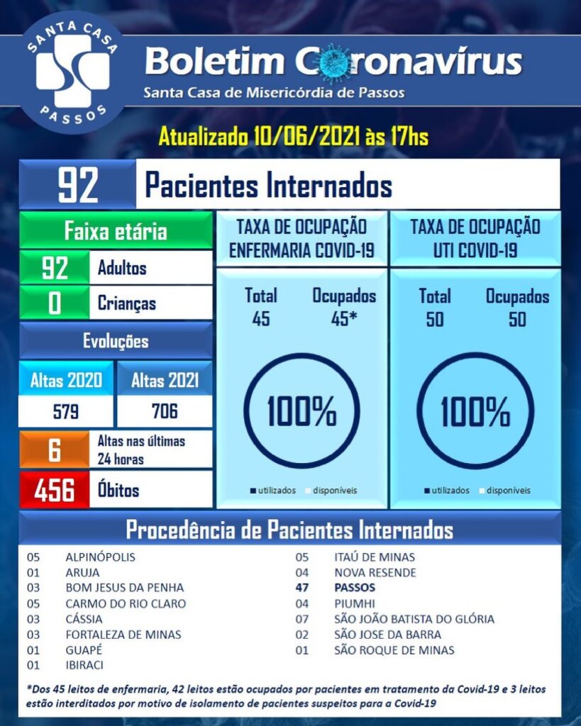 A Santa Casa de Misericórdia de Passos voltou a ficar novamente sem vagas para pacientes de COVID-19. O hospital está com leitos lotados, tanto na enfermaria como na unidade de terapia intensiva (UTI).