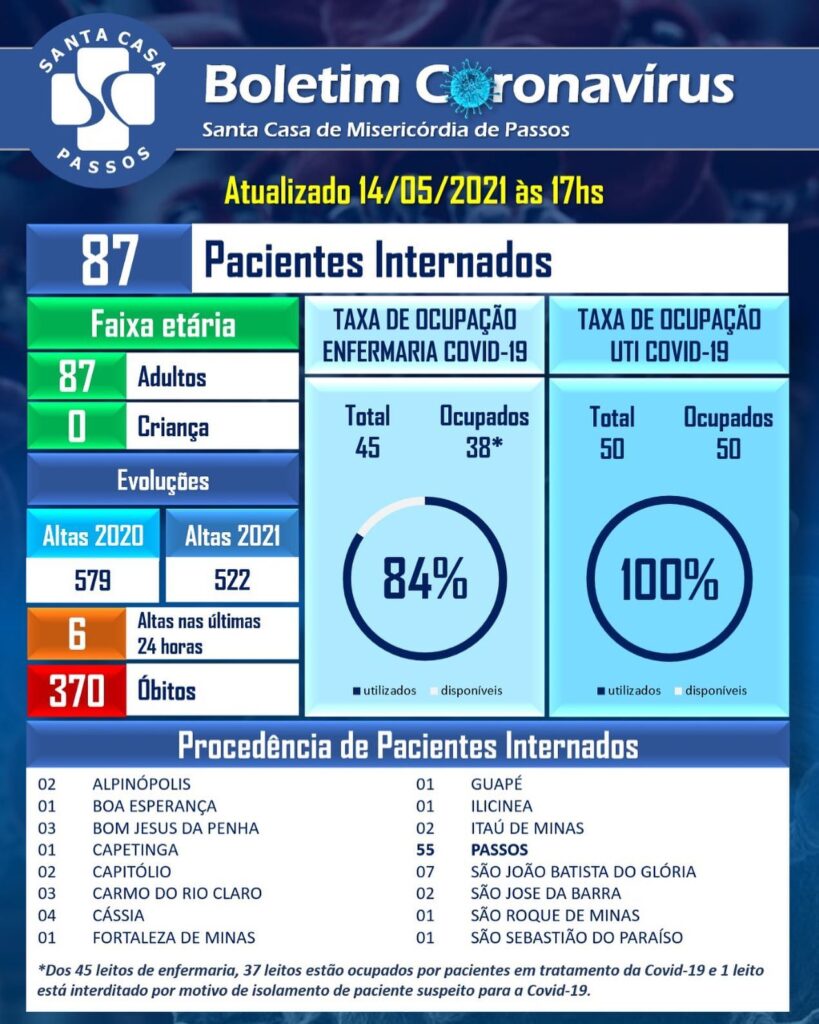 A Santa Casa de Misericórdia de Passos registrou nesta sexta-feira (14), um total de 6 altas médicas e 3 óbitos de pacientes que estavam internados em tratamento da COVID-19.
