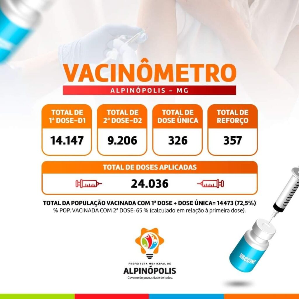De acordo com o vacinometro divulgado pela prefeitura neste domingo, Alpinópolis já vacinou 72% da população com a primeira dose da vacina contra a COVID-19. Já o público que recebeu a segunda dose é de 65%.