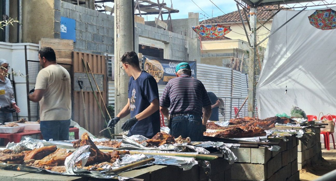 A grande atração do almoço foi o delicioso porco à paraguaia, que começou a ser assado na noite de sábado na própria barraca da festa, montada especialmente para o evento. Os oito porcos, cuidadosamente preparados, foram o destaque do cardápio, atraindo um grande número de pessoas que aguardavam ansiosamente para saborear a iguaria típica e celebrar a fé e a cultura local.