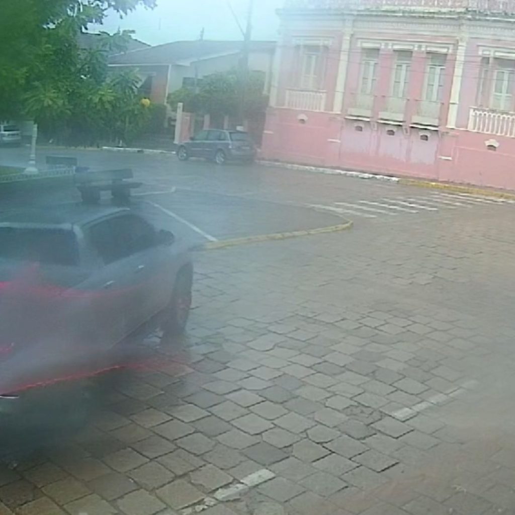 As imagens mostram um homem vestido com uma blusa escura arrombando a porta da caminhonete e saindo sentido a rua Monsenhor Mário.