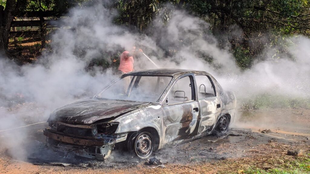 O carro estava na entrada de uma propriedade rural. Segundo o motorista do chevrolet Classic, o fogo começou quando ele tentou ligar o carro e a chave travou, causando um curto circuito.