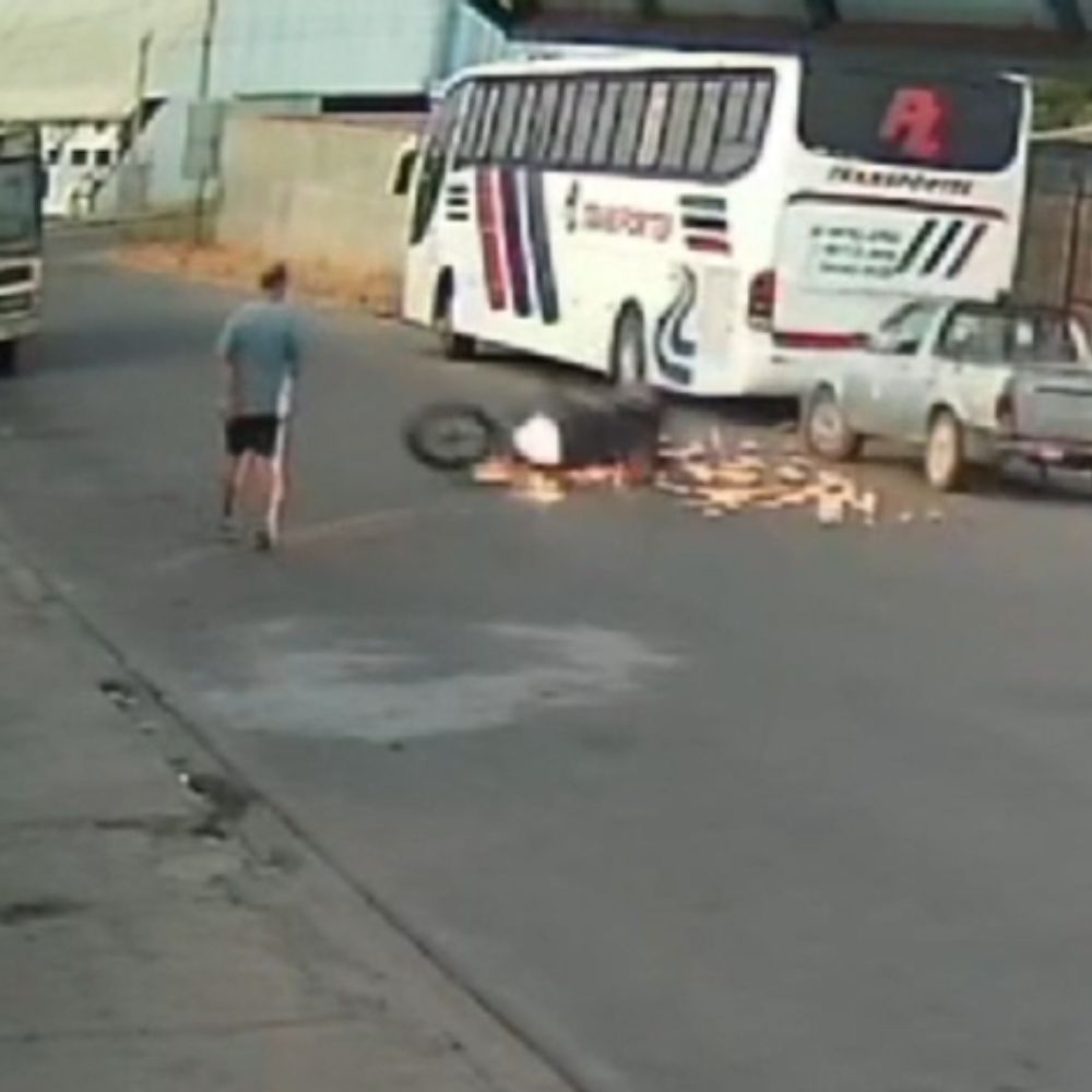 O motociclista se levanta logo em seguida, aparentemente, sem ferimentos.