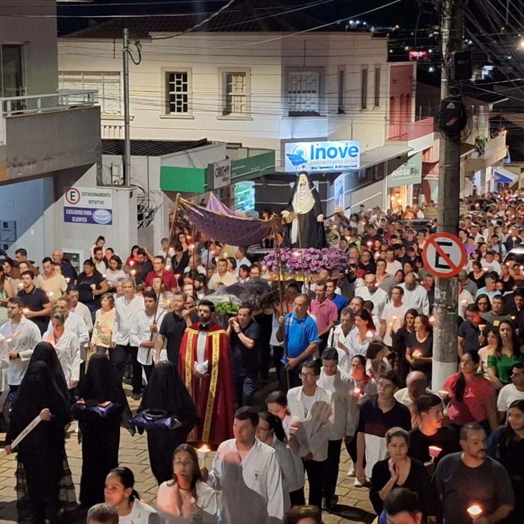 Na noite desta Sexta-feira Santa (18), uma multidão de fiéis acompanhou a emocionante Procissão do Enterro, realizada na Matriz Nossa Senhora do Carmo, em Carmo do Rio Claro. A celebração, que integra o calendário da Semana Santa, é uma das mais aguardadas manifestações religiosas da cidade, reunindo moradores e visitantes em um momento de fé, reflexão e respeito à Paixão de Cristo.