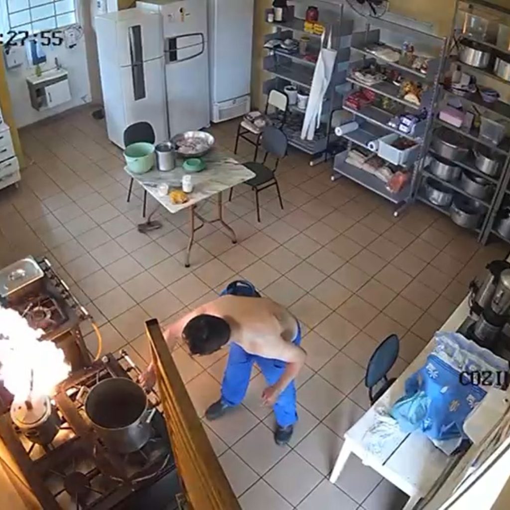 O vídeo, divulgado nas redes sociais, mostra imagens da cozinha da escola e o momento em que um botijão de gás é trocado ao lado de um outro fogão onde uma das chamas estava acesa.