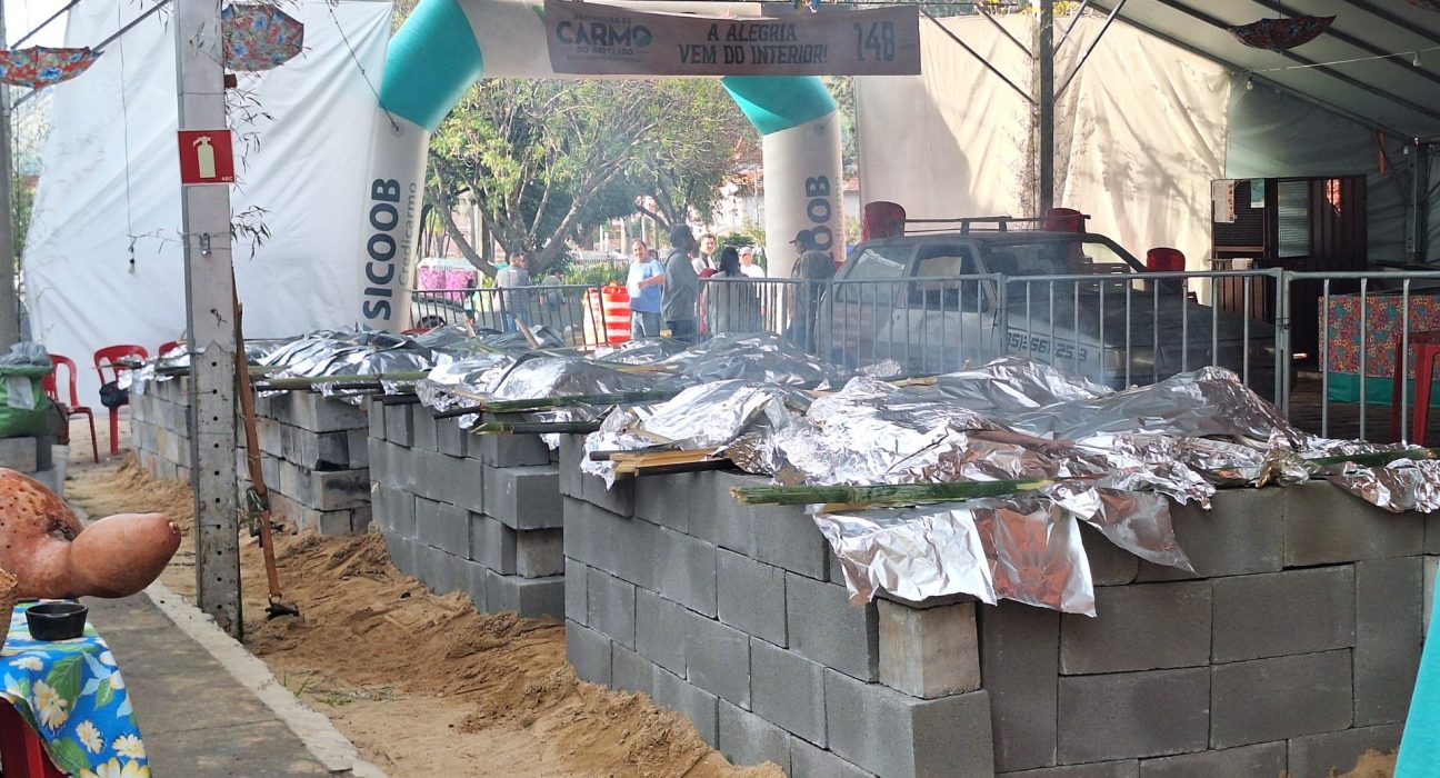 Os preparativos para o almoço festivo do 1º Arraiá da Paróquia Nossa Senhora do Carmo seguem a todo vapor. O prato principal, porco a paraguaia está sendo assado na própria barraca da festa, na praça Dona Maria Goulart, ao lado da igreja matriz. Os que por lá na manhã de hoje já podem se deliciar com o cheiro dos 8 porcos que estão sendo preparados simultaneamente.