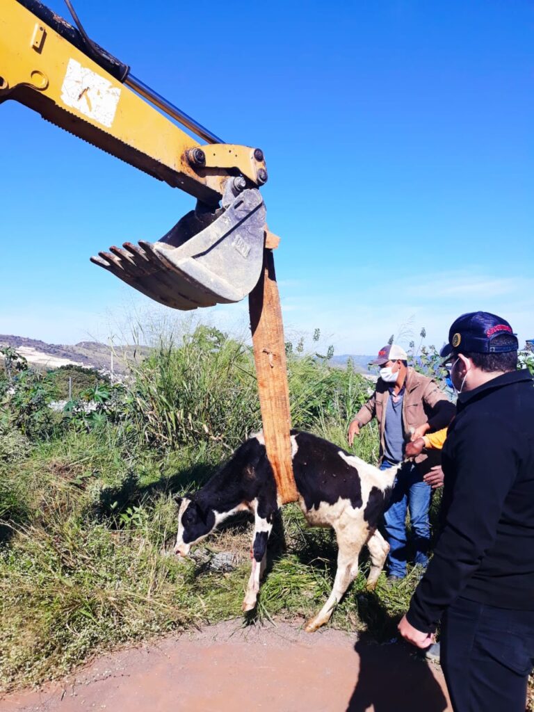 Na manhã desta quinta-feira (24), a Vigilância Ambiental de Alpinópolis foi acionada por moradores para resgatar uma vaca e um bezerro que haviam caído em um buraco com cerca de 2 metros de profundidade e 3 metros de largura no bairro Jardim Europa.